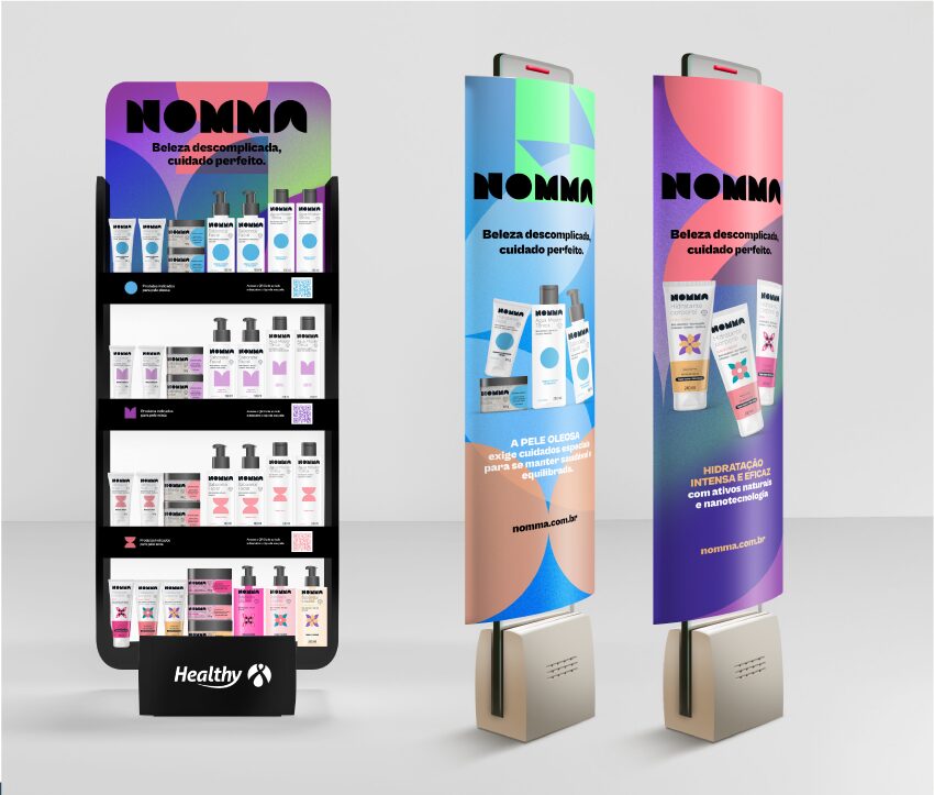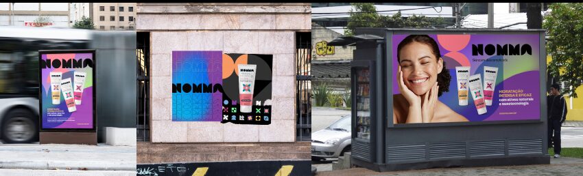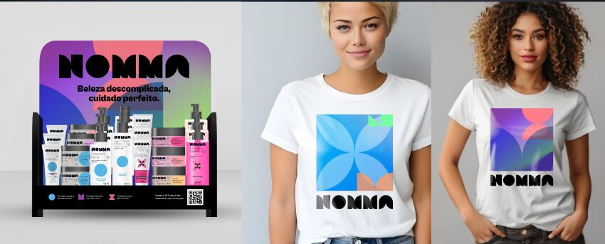 Como uma marca flexível, orgânica e múltipla, NOMMA tem sua tipografia marcante e criada a partir de formas derivadas de 4 quadrados combinados, trazendo robustez, impacto e credibilidade. O preto é sua cor principal, combinada a outras cores alegres e vibrantes o que adiciona energia e singularidade à seriedade do preto.